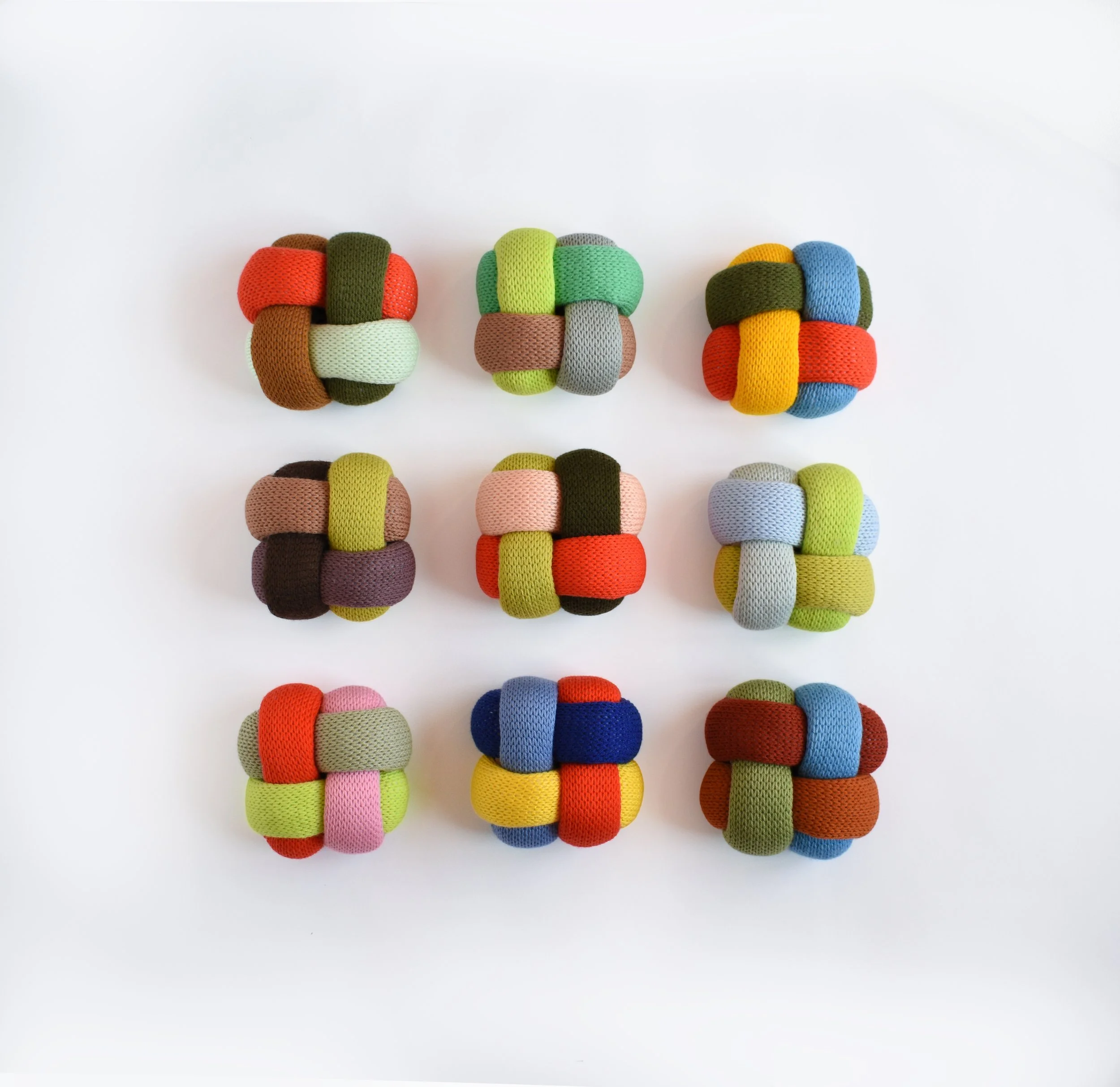 Katrina Sánchez, Installation view of Soft Grids, 2026, knitted yarn, fiber fill, 6 x 6 x 3.5 inches, each